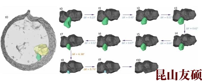 对单个晶粒生长的初步统计结果表明,在实验初期阶段,消失的通常是较小的晶粒。此外,无论晶粒尺寸如何,单个晶粒的取向变化通常很小,但是当晶粒突然出现较大旋转时,大概率发生在较小晶粒消失前的上一次退火处理中。下图展示了一个小晶粒以及它旁边两个稳定的晶粒,小晶粒在消失之前取向旋转了5度以上(因此IPF的颜色从绿色变为青绿色)。